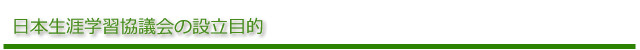 日本生涯学習協議会は、「生涯学習」の理念に基づき、これからの日本社会が目指す一つの方向として、豊かな人間形成及び生き生きとした心豊かな人生を実践していく為には、社会教育特に生涯学習が果たす役割の重要性を認識し、「国民の心身の健康健全で社会的に安寧な状態を維持するため創造的かつ自立的な生涯学習の普及を図るとともに生涯学習指導者の適正な評価・判定を行い、もって社会教育の発展に寄与する」を目的として設立しました。